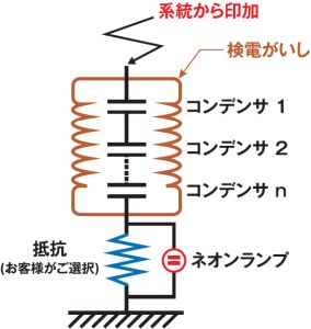 検電がいしの役割は、抵抗と組み合わせることで、系統の高圧側に接続した線が、活線であるかどうか、ネオンランプを発光させて確認するための電圧を取り出すことです。