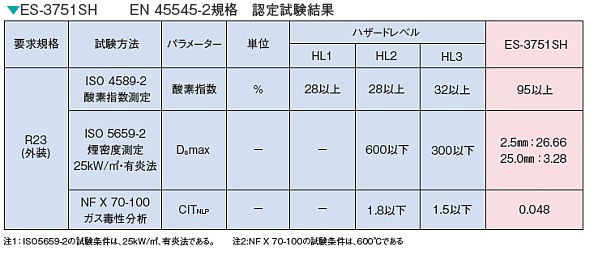 ES-3751SHは、これまでにも発煙の少ない材料として、英国鉄道車両に関する防火規格であるBS 6853の試験において、最も厳しい外部配置カテゴリーの難燃性試験に合格しております。
