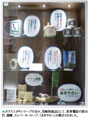 このほかにも、名神高速道路で掲示される東亜通信工材蒲l(西長洲町)の非常電話表示灯、滑ン本吉二商店様(塚口本町)の菰樽(こもだる)、東京スカイツリーなどに採用される神鋼鋼線工業蒲l(中浜町)のエレベーターロープ、そして地元で採れる「あまやさい」が展示されました。