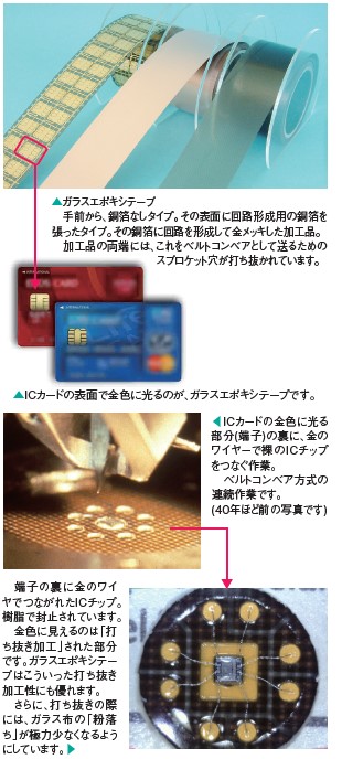 ガラスエポキシテープは、接触型ICカードの端子として採用されるものです。カードの表面で金色に光るあの部分です。この裏側には金のワイヤでつながれた裸のICチップが搭載され、さらに樹脂で封止されています。