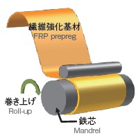 リショーライト熱硬化性樹脂積層管(以下、積層管)は、フェノールやエポキシといった熱硬化性の樹脂を、紙や布あるいはガラス布に含浸させた基材を作り(プリプレグといいます)、これを鉄芯に強固に巻き上げて作るFRPパイプです。