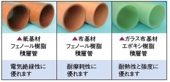 利昌工業では大きく分けて、電気絶縁性に優れた「紙基材フェノール樹脂積層管」、耐摩耗性に優れた「布基材フェノール樹脂積層管」、そして強度と耐熱性に優れた「ガラス布基材エポキシ樹脂積層管」をラインナップしております。